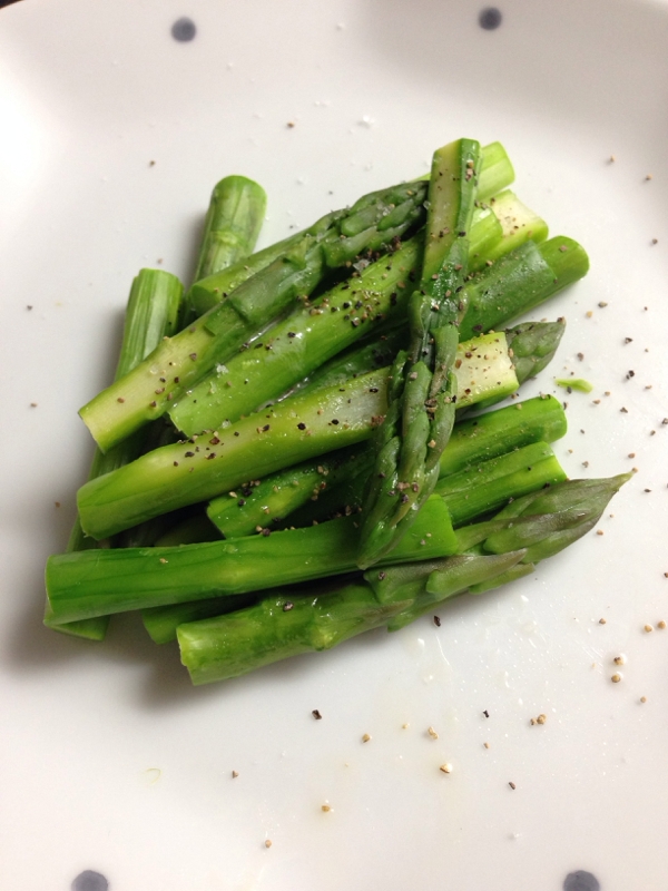 シンプルな焼きアスパラガスは ニンニクオイルと黒胡椒が決め手